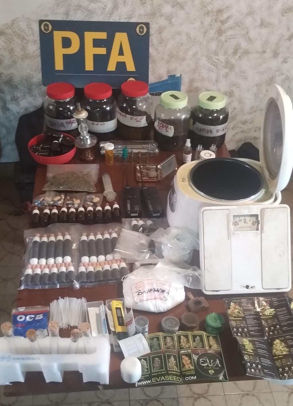 Después de eso la policía halló dos litros de aceite de cannabis contenidos en múltiples frascos; 57 goteros con aceite de cannabis en su interior, 42 pastillas de distintos colores, tamaños e inscripciones y 91 gramos de semillas de cannabis.