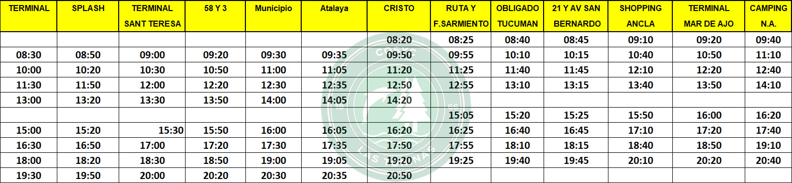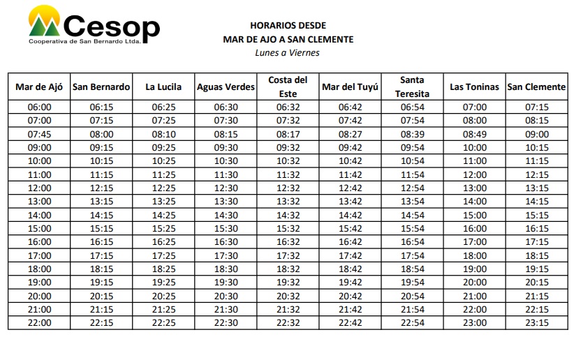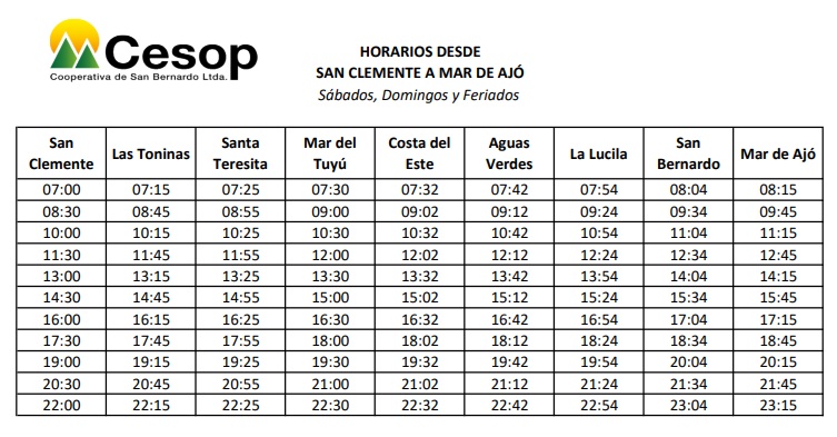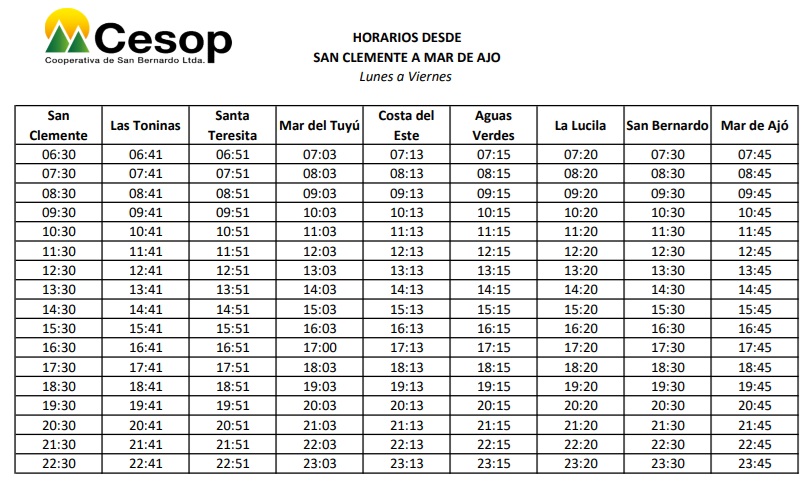 Servicio prestado por la Cooperativa de Electricidad, Servicios y Obras Públicas (CESOP) de San Bernardo. Realiza su recorrido por la ruta 11 entre San Clemente del Tuyú y Mar de Ajó.