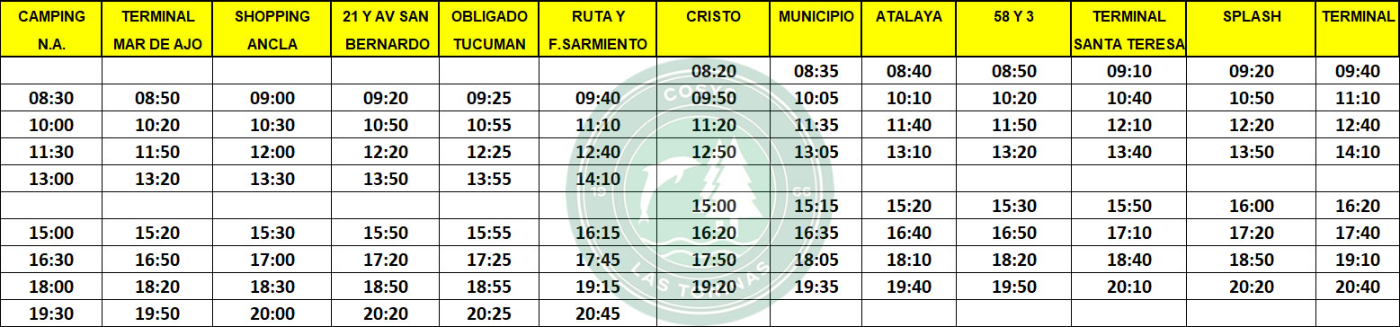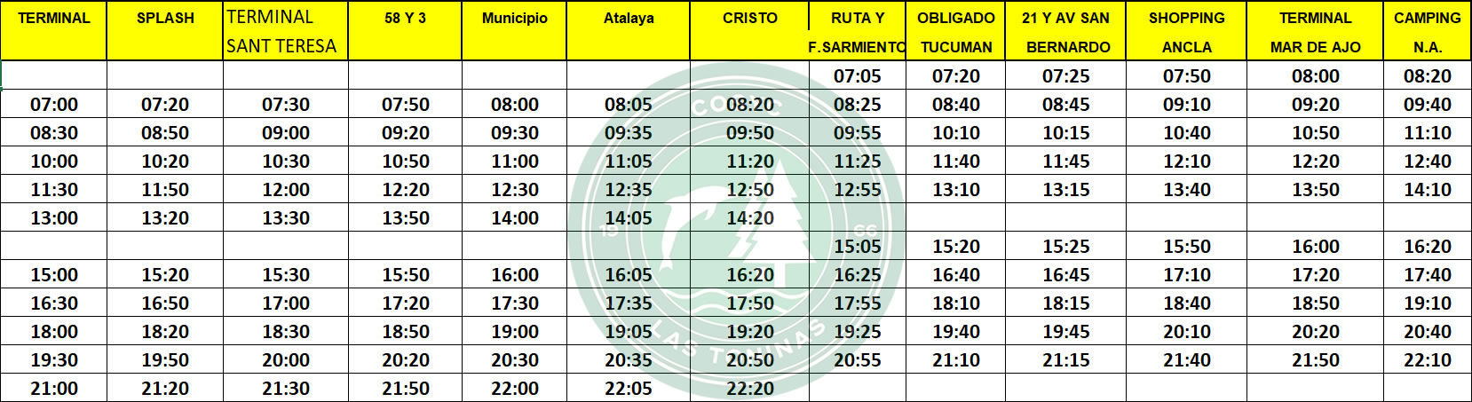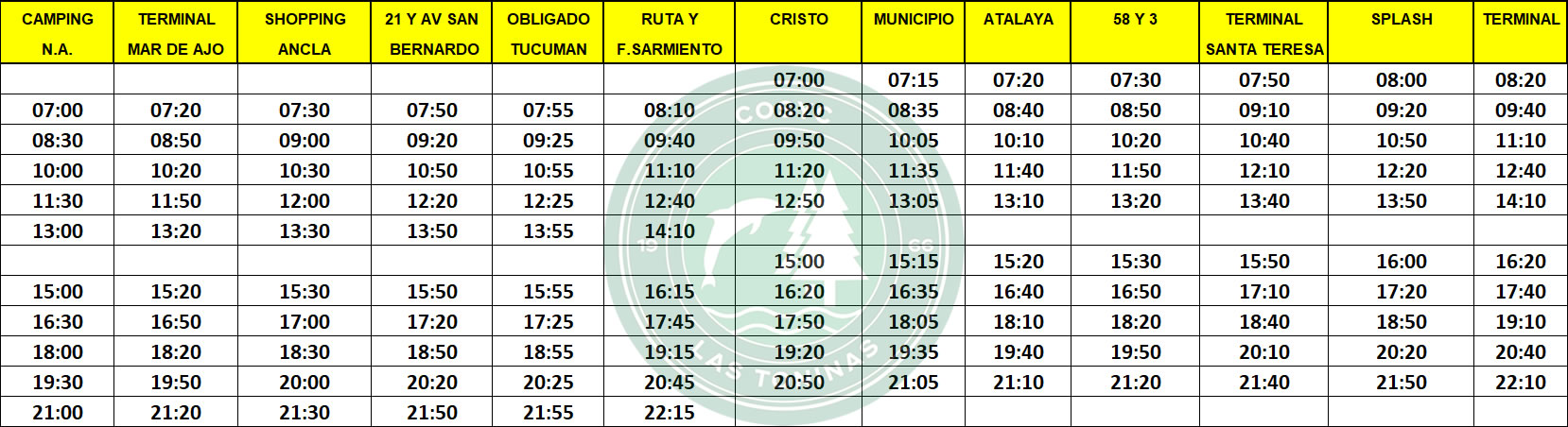 Servicio prestado por la Cooperativa de Provisión de Obras, Servicios Públicos y Consumo (COSYC) de Las Toninas. Realiza su recorrido uniendo las localidades de Aguas Verdes, Lucila del Mar, San Bernardo, Mar de Ajó, Nueva Atlantis y paraje Pavón (General Lavalle).