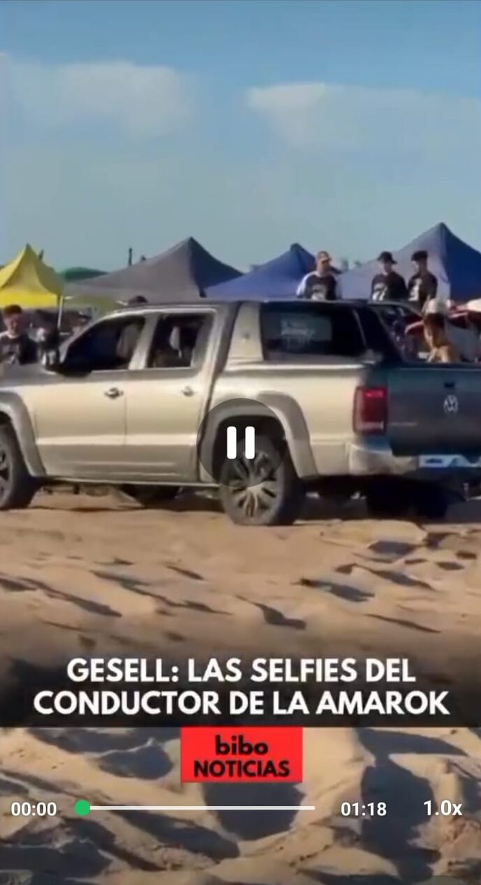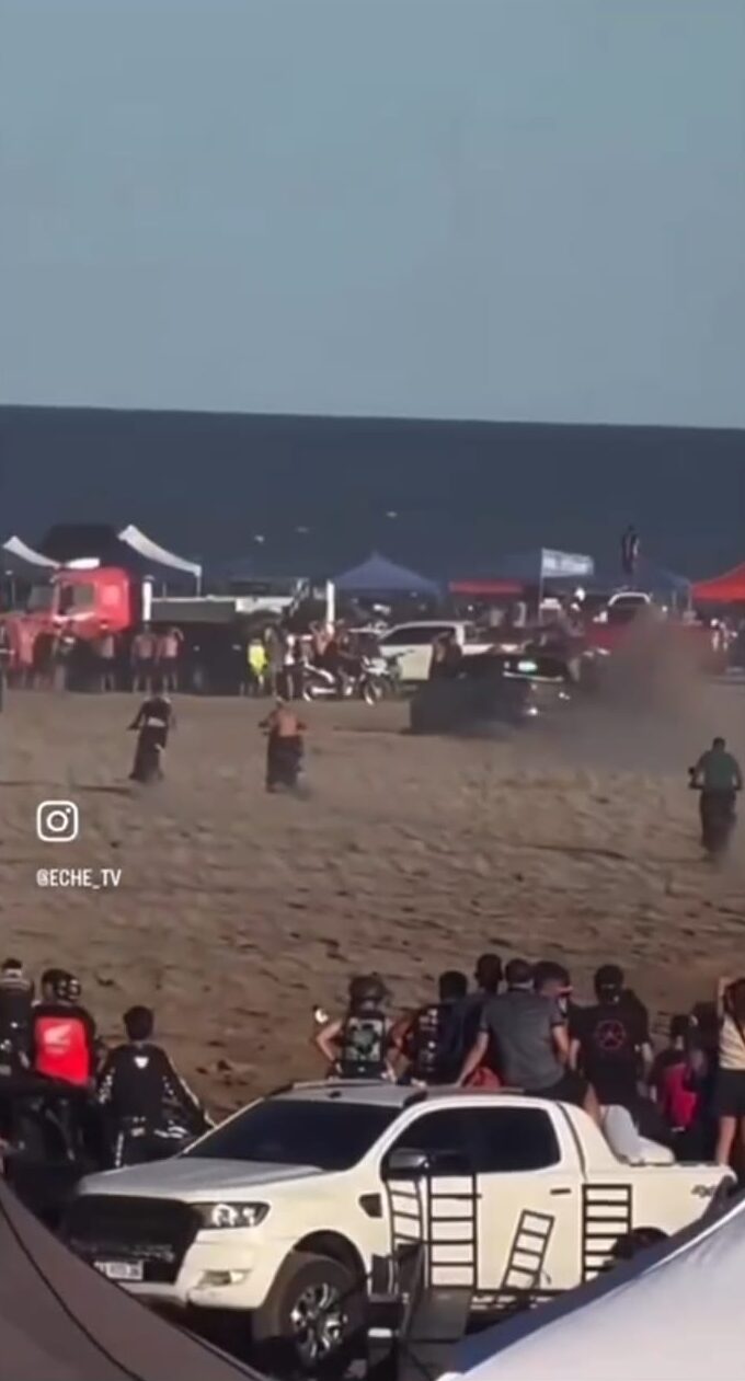 En las imágenes se observa una camioneta marca Volkswagen modelo Amarok desplazándose a alta velocidad en un sector donde había una importante concentración de personas, motocicletas y otros vehículos, en el marco de un encuentro no autorizado.