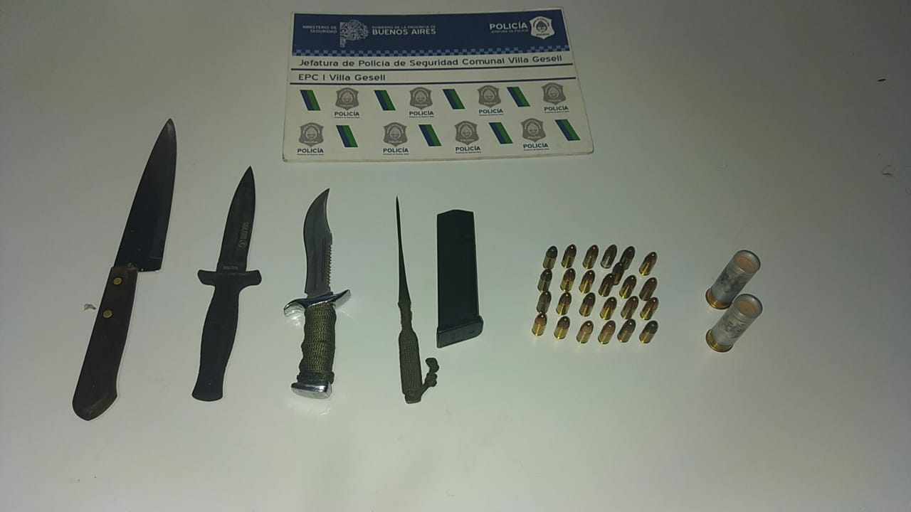 Además, se demoraron otros dos sujetos, no residentes, por ingerir bebidas alcohólicas en la vía pública y por ruidos molestos. En ese sentido, se les incautó el vehículo en el cual circulaban por no poseer documentación y además se los halló en poder de un cargador de arma marca Glock calibre 9mm, dos cartuchos posta de goma de calibre 12/70, una cuchilla de cocina, tres puñales, y otras bebidas alcohólicas y energizantes. Los individuos quedaron a disposición de la justicia y los organismos municipales correspondientes.